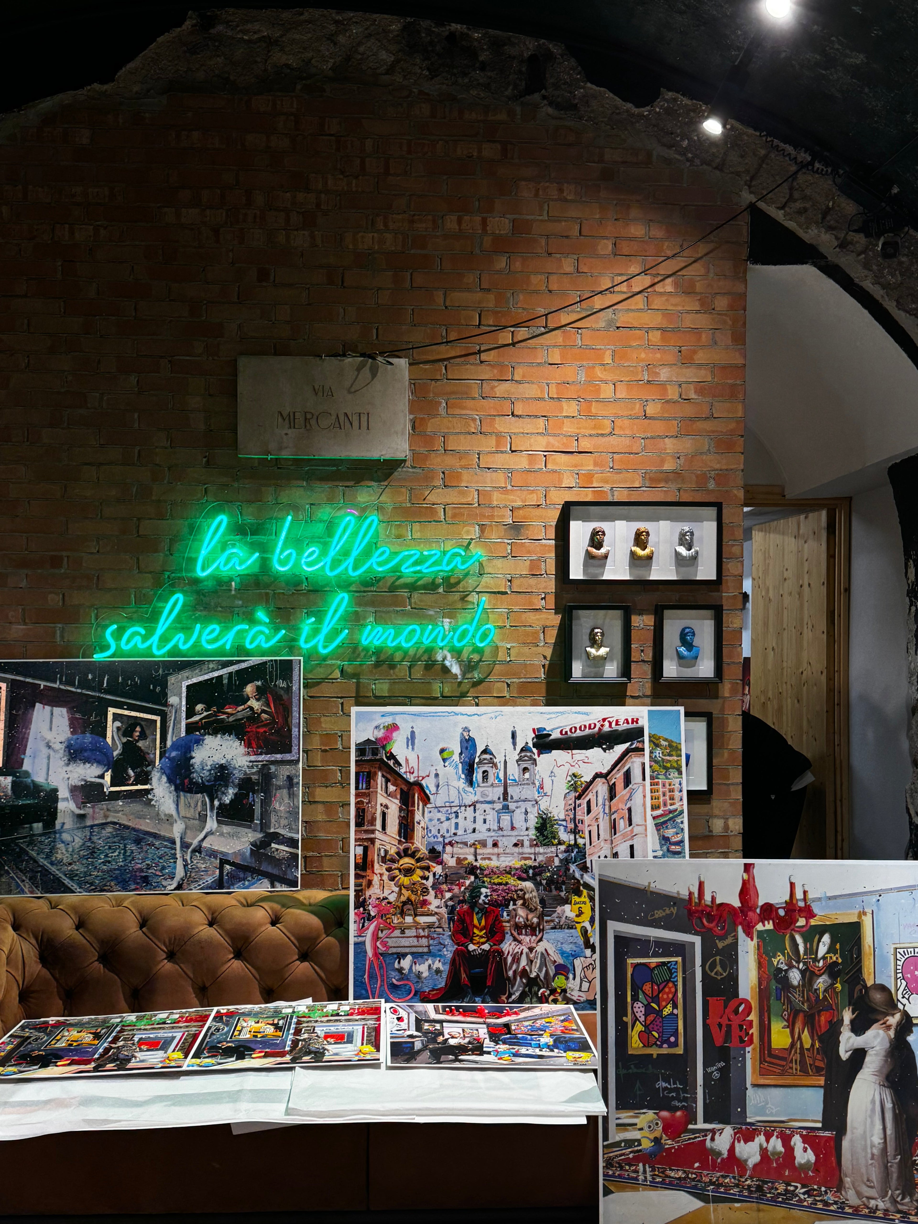 Pop art, sculture illuminate, oggetti vintage reinterpretati, opere che fondono ironia, lusso e memoria: qui trovi Marco Lodola, Van Apple, pezzi unici restaurati (come le storiche pompe di benzina anni ’60) e autori che hanno segnato la storia dell’arte italiana e internazionale.